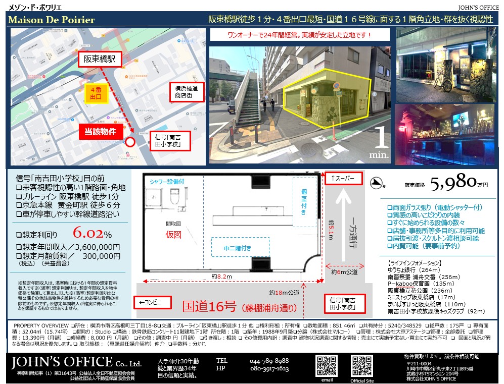 坂東橋区分店舗 5980万円成約御礼。by 管理人に その他on 投稿日: 2025年2月6日2025年2月6日 多数のお問合せを頂きまことにありがとうございました。本件はご成約済となりました。 \ 最新情報をチェック / FacebookXBlueskyHatenaCopy